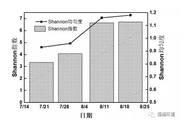 八干渠河道底泥原位修復(fù)前后Shannon指數(shù)和均勻度變化