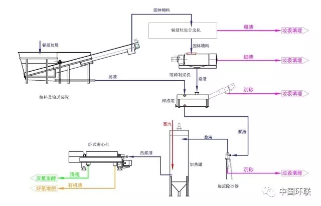 餐廚垃圾運輸車經卸料口將餐廚垃圾卸至接料裝置,然后輸送到垃圾分選機;餐廚垃圾經破袋后初步分選出較大的塑料袋、易拉罐、布條等雜物;經初分選后的餐廚垃圾進入破碎制漿機,經處理后成為漿液,固體物直徑≤10mm,其中的碎塑料片、瓶蓋等輕質雜物也被分選出。漿液經除砂器去除重質沉砂后進入加熱系統(tǒng)。