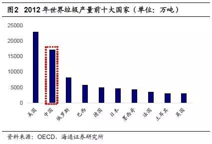 我國城鎮(zhèn)垃圾產(chǎn)量巨大。根據(jù)國家統(tǒng)計局?jǐn)?shù)據(jù),2000年我國的常住人口城鎮(zhèn)化率僅為36.22%,到2015年末為56.1%,年均增加1.33個百分點,城鎮(zhèn)人口的不斷增加使得城鎮(zhèn)生活垃圾產(chǎn)生量與日俱增。根據(jù)OECD數(shù)據(jù),2012年我國垃圾清運(yùn)量僅次于美國,高居世界第二位,且遙遙領(lǐng)先于后面的俄羅斯、巴西、德國等國家。根據(jù)國家統(tǒng)計局?jǐn)?shù)據(jù),2001年我國垃圾清運(yùn)量為1.35億噸,2015年為1.91億噸,CAGR為3.27%。