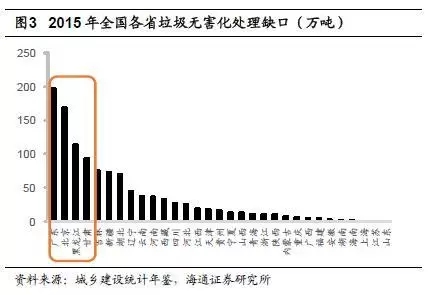 城鎮(zhèn)垃圾無害化處理缺口巨大。以人均垃圾產(chǎn)生量1.2kg/日來計算,2015年我國城鎮(zhèn)垃圾生產(chǎn)總量為3.38億噸,而2015年我國垃圾清運(yùn)量為1.91億噸,對應(yīng)缺口巨大。另一方面,從清運(yùn)量看,2015年我國生活垃圾無害化處理量為1.8億噸,無害化處理率為94.1%,對應(yīng)全國無害化處理總?cè)笨跒?129萬噸,分省區(qū)來看,缺口最大的有廣東(196萬噸)、北京(168萬噸)、黑龍江(114萬噸)、甘肅(94萬噸)。2006-2015年間,我國生活垃圾無害化處理缺口累計超過3.6億噸。