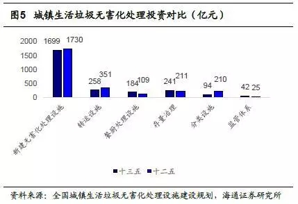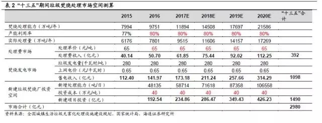 按照垃圾焚燒規(guī)劃新增處理能力對市場空間進(jìn)行測算,“十三五”期間垃圾焚燒處理費(fèi)市場空間總計近400億元,焚燒發(fā)電市場空間約1100億元,兩者合計運(yùn)營收入約1500億元;此外,新增處理能力所需的建設(shè)投資總計近1500億元,垃圾焚燒市場空間巨大。