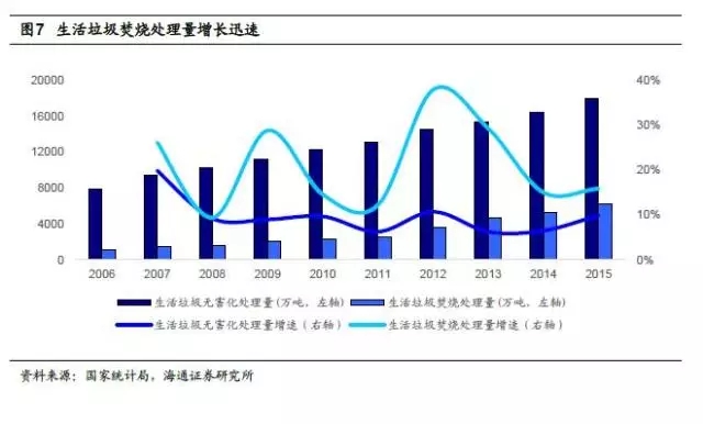目前衛(wèi)生填埋處理占主導(dǎo)地位,長期看焚燒處理優(yōu)勢明顯、增速較快。常見的垃圾無害化處理方式有衛(wèi)生填埋、焚燒和高溫堆肥。其中,我國垃圾焚燒處理量占比從2006年的14.45%上升到2015年的34.28%,2015年焚燒處理量為6176萬噸,處理能力為21.9萬噸/日(約8000萬噸/年);衛(wèi)生填埋占比從2006年的81.4%下降到2015年的63.75%,2015年處理量為11483萬噸,處理能力為34.4萬噸/日(約12600萬噸/年),而近年高溫堆肥處理量極少,2015年僅為354萬噸。垃圾焚燒與填埋法相比,經(jīng)濟(jì)效益和環(huán)境保護(hù)程度更高:①減量縮容:在垃圾經(jīng)過焚燒后,一般可減重80%,減容90%以上,節(jié)約大量的土地資源;②資源再利用:按熱值比較,每噸生活垃圾約相當(dāng)于0.2-0.25噸標(biāo)準(zhǔn)煤,垃圾焚燒發(fā)電的資源綜合利用效益相當(dāng)可觀;③污染弱:垃圾焚燒主要產(chǎn)生的氣體為二氧化碳。因而垃圾焚燒成為近年來國家推崇的無害化處理方式,在垃圾無害化處理中的占比逐年上升。
