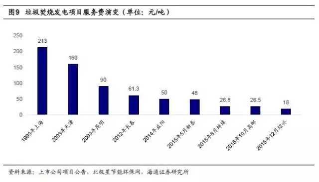 行業(yè)競爭加劇,處理費(fèi)下行。在市場參與者逐漸增多和行業(yè)競爭逐步加劇的背景下,近年新建的垃圾焚燒項目處理費(fèi)呈下降趨勢。2015年以來,一些企業(yè)為了搶占市場而壓低價格,低價中標(biāo)項目涌現(xiàn):2015年山東新泰項目中標(biāo)價48元/噸,安徽蚌埠項目中標(biāo)價26.8元/噸,江蘇高郵項目中標(biāo)價26.5元/噸,浙江紹興項目中標(biāo)價更是降至18元,擾亂市場正常秩序。除去少數(shù)惡意壓低價格的項目,根據(jù)中國經(jīng)濟(jì)導(dǎo)報統(tǒng)計,近年來垃圾焚燒特許經(jīng)營項目處理費(fèi)每噸平均在60~80元,整體呈現(xiàn)小幅下降的趨勢。