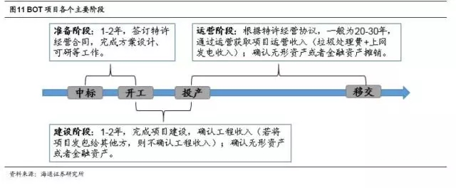 對項目公司而言,項目中標(biāo)后,主要會經(jīng)歷三個階段,分別是準(zhǔn)備階段(一般為1-2年,完成項目的前期準(zhǔn)備工作,簽訂特許經(jīng)營合同,完成環(huán)評、可研報告等工作)、建設(shè)階段(一般為1-2年,完成項目建設(shè),確認(rèn)工程收入,若項目外包給其他方,則不確認(rèn))和運(yùn)營階段(在特許經(jīng)營期內(nèi),負(fù)責(zé)項目的運(yùn)營,獲取垃圾處理費(fèi)補(bǔ)貼和上網(wǎng)發(fā)電收入),特許經(jīng)營期到期之后,項目無償移交給政府。