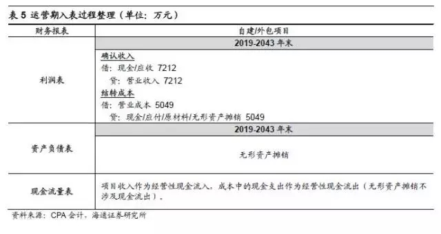 若該項目為項目公司自建,則建設(shè)期項目公司將根據(jù)完工進(jìn)度確認(rèn)工程收入并計入在建工程,項目完工后在建工程轉(zhuǎn)為無形資產(chǎn),工程階段雖有工程收入并確認(rèn)利潤,但并無實際經(jīng)營性現(xiàn)金流入。若項目公司將項目發(fā)包,通常不確認(rèn)工程收入,即建造期不影響利潤表,根據(jù)完工進(jìn)度向承包方支付工程款,確認(rèn)在建工程,項目完工后將在建工程結(jié)轉(zhuǎn)為無形資產(chǎn)。項目運(yùn)營階段,公司確認(rèn)項目運(yùn)營收入(主要是垃圾處理費(fèi)和上網(wǎng)發(fā)電收入),結(jié)轉(zhuǎn)相關(guān)成本,成本項包含無形資產(chǎn)的攤銷。項目建設(shè)期和運(yùn)營期的主要會計科目錄入如表4和表5: