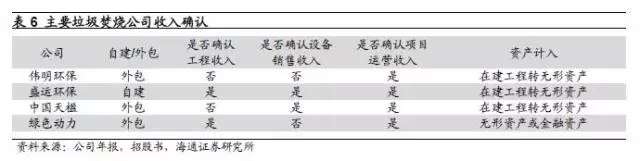 通常而言,對于垃圾焚燒BOT項目,如果公司自建,則會確認(rèn)工程收入,如果將項目外包,則不確認(rèn)工程收入。四家公司中,盛運(yùn)環(huán)保項目主要為自建,并且確認(rèn)工程收入,而偉明環(huán)保和中國天楹主要采取外包的方式,不確認(rèn)工程收入。綠色動力有所不同,公司將項目發(fā)包給其他方,但考慮到其對項目負(fù)有整體履約責(zé)任并承擔(dān)所有費(fèi)用和風(fēng)險,在項目建造階段確認(rèn)相應(yīng)的建造收入,該等建造收入根據(jù)獨(dú)立評估師評定的公允價值計量。此外,盛運(yùn)環(huán)保和中國天楹確認(rèn)設(shè)備銷售收入,偉明環(huán)保與綠色動力則不確認(rèn),四家公司都確認(rèn)項目運(yùn)營收入。