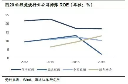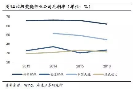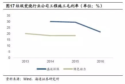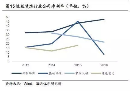 偉明環(huán)保項目運(yùn)營毛利率較高,2015年為65.9%,2016年小幅下降,為62.5%;中國天楹運(yùn)營業(yè)務(wù)毛利率也相對較高,2016年為49.2%,但相較于2014年的65.1%下滑近16個百分點;綠色動力2015年毛利率為49.0%;盛運(yùn)環(huán)保2015年運(yùn)營業(yè)務(wù)毛利率為45.3%,2016年為18.0%。