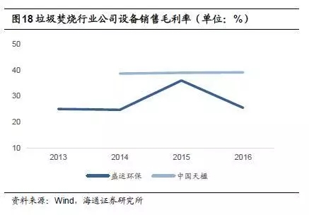 盛運(yùn)環(huán)保和中國天楹兩家公司確認(rèn)設(shè)備銷售毛利率,中國天楹設(shè)備毛利率較為穩(wěn)定,近三年維持在38%-39%之間,盛運(yùn)環(huán)保設(shè)備銷售毛利率略低,2015年為36.0%,2016年為25.5%。