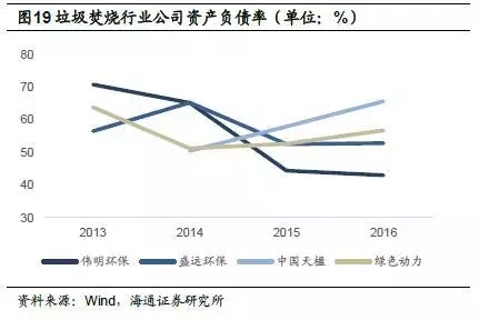 偉明環(huán)保ROE較高,2016年為17%,但相較2013、2014年有一定下滑;盛運(yùn)環(huán)保2016年ROE出現(xiàn)較大下滑,僅為2.3%;中國天楹2016年ROE為10.3%;綠色動力ROE上升趨勢明顯,2016年達(dá)到13.0%,較2015年上升3.6個百分點。