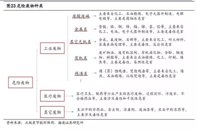 工業(yè)危廢是危險廢物的主要來源,具體危廢類型包括廢堿、廢酸、石棉廢物、有色金屬冶煉廢物、無機(jī)氰化物廢物、廢礦物油等,從上游行業(yè)看,主要來自化學(xué)原料和化學(xué)制品制造業(yè)、有色金屬冶煉和壓延加工業(yè)、非金屬礦采選業(yè)、造紙和紙制品業(yè)、有色金屬礦采選業(yè)等。