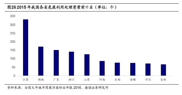 我國危廢綜合利用與處置行業(yè)格局分散,市場集中度較低。2015年全國危廢許可證(含醫(yī)療危廢)數(shù)量為2034個,較前一年增加113個,其中江蘇省頒發(fā)的危廢許可證數(shù)量為327個,數(shù)量上排名第一,湖南、廣東分列二、三位,數(shù)量在150個左右,浙江、山東也超過100個。截止到2015年,全國危險廢物經(jīng)營單位核準(zhǔn)經(jīng)營規(guī)模達(dá)到5263萬噸/年,其中核準(zhǔn)利用規(guī)模為4155.1萬噸/年,核準(zhǔn)處置規(guī)模為982.4萬噸/年,平均每個許可證僅對應(yīng)2.59萬噸/年的利用和處置能力。根據(jù)2008年環(huán)保部公布的危廢處置名單,當(dāng)時全國1500多家具有危廢處理資質(zhì)的企業(yè)中,處理能力達(dá)到1000噸/日的企業(yè)僅占0.3%,目前行業(yè)格局沒有太大變化。