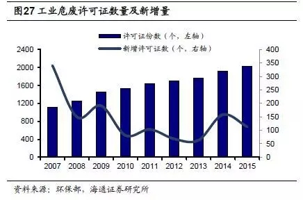 我國政府對危廢處理行業(yè)實行許可證制度。這一方面能夠保證從事危廢處理業(yè)務(wù)的公司基本擁有較強(qiáng)的技術(shù)實力和項目經(jīng)驗,從而保障危廢無害化處理的效率,減少處理不當(dāng)造成的二次污染;另一方面,實行許可證制度會限制新進(jìn)企業(yè)數(shù)量,限制全國危廢綜合利用和處置總量。
