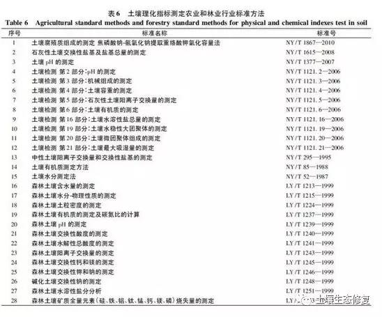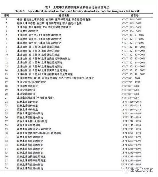 8個理化指標等方法中,涉及5個測定指標(電導率、氧化還原電位、有機碳、可交換酸度、干物質(zhì)和水分等),以及5種測定方法(電極法、滴定法、重量法、分光光度法和非分散紅外法等)。另外,農(nóng)業(yè)、林業(yè)也有土壤檢測標準方法,主要側(cè)重于土壤營養(yǎng)元素及其有效態(tài)、理化指標的檢測,詳見表5和表6。農(nóng)業(yè)行業(yè)標準方法中,有21個涉及無機元素及其有效態(tài)測定的方法,有15個涉及土壤理化指標的方法;林業(yè)行業(yè)標準方法針對的是森林土壤,有15個涉及無機元素及其有效態(tài)測定的方法,有13個涉及土壤理化指標的方法。