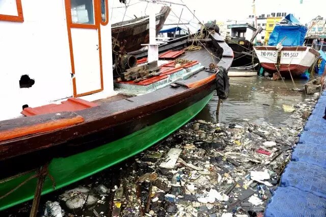 Versova海灘的部分垃圾來自于附近的街區(qū),而更大一部分來自于默拉得河(Malad Creek)的雨水排水管。河面看起來仍然很漂亮,但實(shí)際上,遠(yuǎn)岸的紅樹林,以及停靠在高水位的漁船間隙中,是成堆成堆的垃圾。