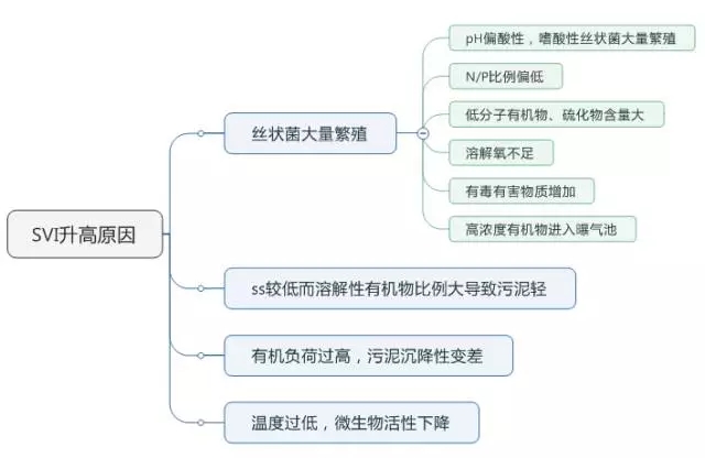 SVI值與污泥負(fù)荷有關(guān),污泥負(fù)荷過(guò)高或過(guò)低,活性污泥的代謝性能都會(huì)變差,SVI值也會(huì)變很高,存在出現(xiàn)污泥膨脹的可能。