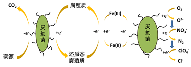 利用醌類物質(zhì)及其聯(lián)合氧化鐵的電子穿梭作用和腐殖質(zhì)中醌類結(jié)構(gòu)大量存在的特點(diǎn),通過(guò)在厭氧生物體系中加入腐殖質(zhì)或者同時(shí)加入腐殖質(zhì)和氧化鐵,促進(jìn)體系中的電子傳遞效率,達(dá)到顯著提升高氯酸鹽/硝酸鹽還原效率的效果。