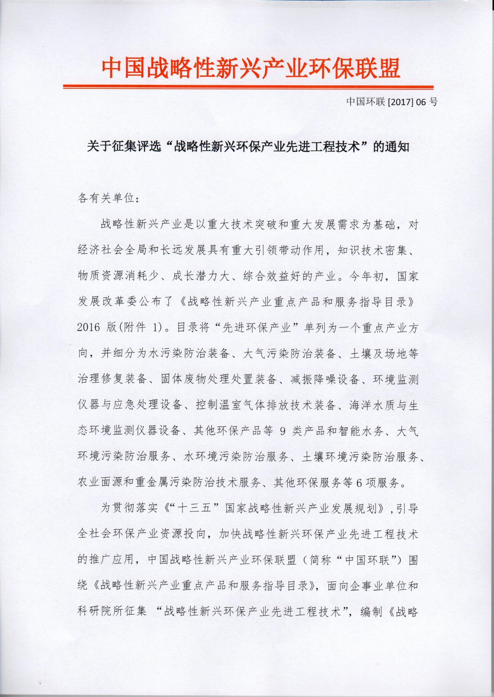 為貫徹落實《“十三五”國家戰(zhàn)略性新興產業(yè)發(fā)展規(guī)劃》,引導全社會環(huán)保產業(yè)資源投向,加快戰(zhàn)略性新興環(huán)保產業(yè)先進工程技術的推廣應用,中國戰(zhàn)略性新興產業(yè)環(huán)保聯(lián)盟(簡稱“中國環(huán)聯(lián)”)圍繞《戰(zhàn)略性新興產業(yè)重點產品和服務指導目錄》,面向企事業(yè)單位和科研院所征集“戰(zhàn)略性新興環(huán)保產業(yè)先進工程技術”,編制《戰(zhàn)略性新興環(huán)保產業(yè)先進工程技術名錄》。