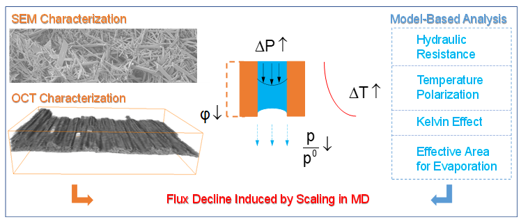 作為新型膜分離技術(shù)的代表之一,膜蒸餾在處理高濃度鹵水和苦咸水中具有獨(dú)特優(yōu)勢(shì)。然而,微溶無(wú)機(jī)鹽在膜蒸餾過(guò)程中結(jié)晶并形成結(jié)垢層是制約該技術(shù)發(fā)展的難題之一;尤其以硫酸鈣為代表的非堿性微溶鹽,目前仍缺乏有效的解決方法,其相關(guān)機(jī)理的研究對(duì)推動(dòng)膜蒸餾技術(shù)的應(yīng)用具有重要意義。結(jié)垢的發(fā)生不但會(huì)造成通量的下降,還會(huì)對(duì)分離膜產(chǎn)生不可逆的損傷。由于表征技術(shù)的相對(duì)欠缺,膜蒸餾過(guò)程中結(jié)垢現(xiàn)象發(fā)生和演化的機(jī)理仍未被充分解析。