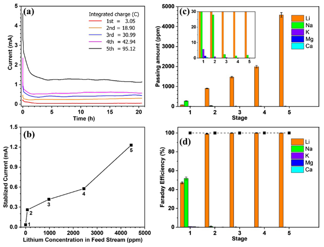圖2.(a)提鋰過程中每一級的計時電流曲線,曲線與時間的積分即為該過程中遷移的總電荷量;(b)提鋰過程中穩(wěn)定電流與原料鋰濃度的關(guān)系;(c)提鋰過程中每一級的離子通過量;插圖顯示情節(jié)在低范圍內(nèi),以幫助查看干擾離子的結(jié)果:(d)提鋰過程中每一級中不同離子的遷移對電流的貢獻(xiàn)率。實心方塊表示總體效率(100%)。