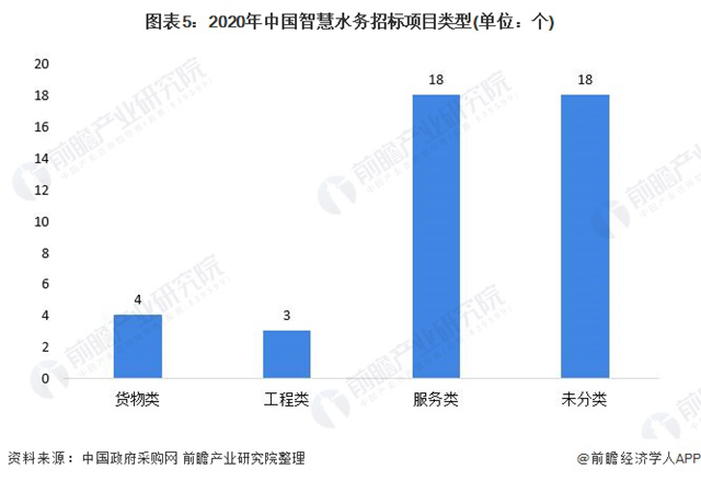 從項(xiàng)目類型來(lái)看,我國(guó)智慧水務(wù)項(xiàng)目采購(gòu)內(nèi)容包括貨物類、工程類和服務(wù)類。2020年,我國(guó)智慧水務(wù)招標(biāo)項(xiàng)目中貨物類項(xiàng)目4個(gè),工程類項(xiàng)目3個(gè),服務(wù)類項(xiàng)18個(gè),未分類項(xiàng)目18個(gè)。