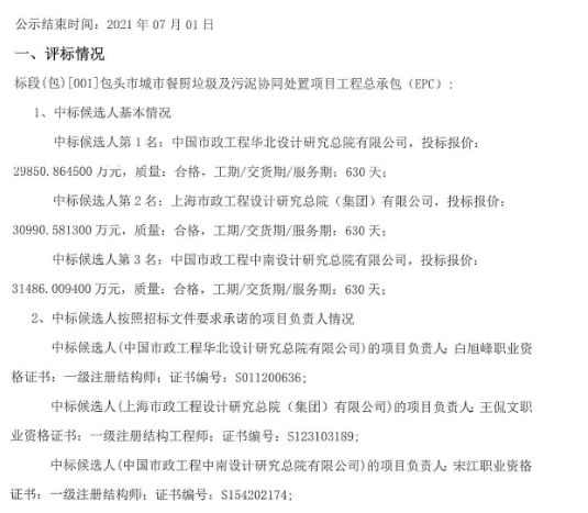 近日,包頭市公共資源交易網(wǎng)發(fā)布了包頭市城市餐廚垃圾及污泥協(xié)同處置項目工程總承包(EPC)中標候選人公示,公示顯示該項目第一中標候選人為中國市政工程華北設(shè)計研究總院有限公司,投標報價為298508645元。