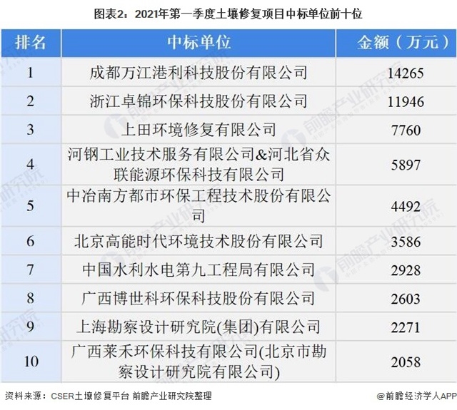 2、中國土壤修復(fù)項目中標(biāo)單位排名