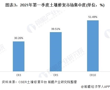 目前,中國土壤修復(fù)行業(yè)的市場集中度較低,競爭較為激烈。CSER土壤修復(fù)平臺數(shù)據(jù)顯示,2021年第一季度土壤修復(fù)項目中標(biāo)金額前3的中標(biāo)金額份額合計30.26%,排名前5的份額合計為39.51%,排名前5的份額合計為51.49%,市場集中度較高。
