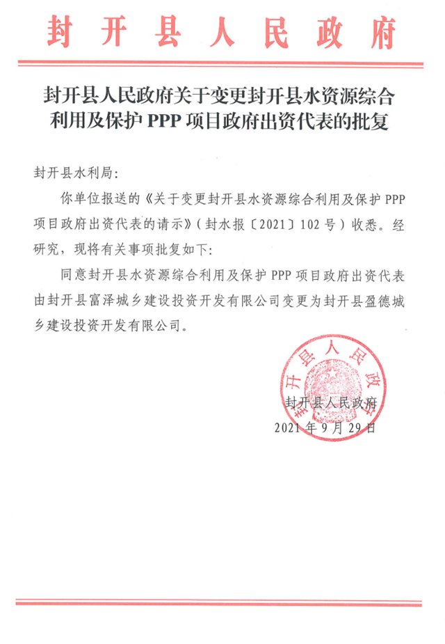 4、封開縣人民政府關(guān)于變更封開縣水資源綜合利用及保護(hù)PPP項(xiàng)目政府出資代表的批復(fù)