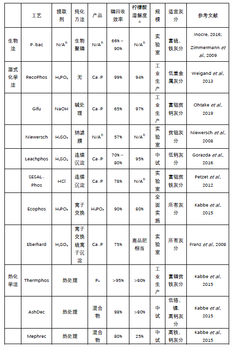 熱化學(xué)法是在900~2000 ℃高溫下,將重金屬及其化合物氣化(或液化),通過氣相分離(或密度分離)裝置實(shí)現(xiàn)重金屬與磷的分離。因此,熱化學(xué)法借助于高溫環(huán)境,可同時(shí)實(shí)現(xiàn)磷提取與磷純化。另外,高溫環(huán)境通過打破灰分中原有礦物相,形成新的磷酸鹽礦物相(Ca-P) 繼而提高了磷酸鹽的可植物利用度。目前,具有代表性的熱化學(xué)法有Thermphos、AshDec和Mephrec工藝。各個(gè)方法的比較如下表所示。