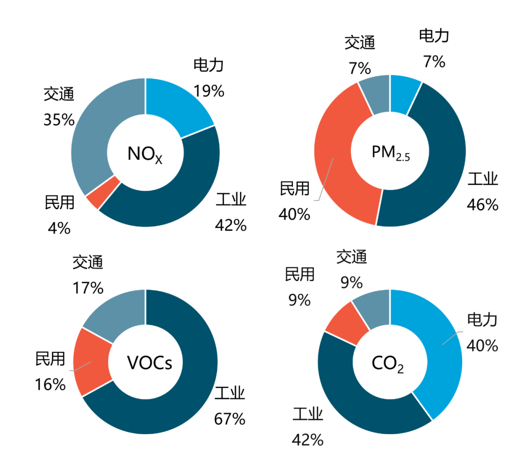 圖4 2017 年重點部門主要大氣污染物和CO2 排放貢獻