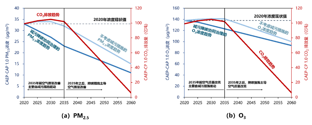 圖2 以環(huán)境質(zhì)量改善目標優(yōu)化協(xié)同管控思路示意注:圖中網(wǎng)格顏色僅示意排放量及影響水平大小差異,不指代具體數(shù)值;由綠到紅表示排放及環(huán)境影響水平逐漸增大2.1 大氣環(huán)境治理與碳減排的協(xié)同路徑與思路我國大氣污染與 CO2 排放同根同源,具備協(xié)同治理的巨大潛力。從中長期來看,應科學研判不同歷史時期減污與降碳的主要驅(qū)動力,系統(tǒng)謀劃協(xié)同減排路徑。從區(qū)域?qū)用鎭砜?,應著重關注大氣污染嚴重的地區(qū),這些地區(qū)通常也是碳排放量大的區(qū)域。從行業(yè)和部門層面來看,重化工業(yè)、交通運輸、民用等均是大氣污染物和 CO2 排放的主要來源,應作為協(xié)同治理的重點予以關注。此外,推動城市空氣質(zhì)量達標和碳排放達峰“雙達”試點示范,探索典型城市實現(xiàn)“雙達”的主要路徑、關鍵措施、政策機制,也是有益嘗試。已有研究表明 [12, 13, 16],碳達峰碳中和目標愿景對驅(qū)動空氣質(zhì)量改善有巨大貢獻。如圖 3 所示,在碳達峰碳中和目標的驅(qū)動下,全國 PM2.5年均濃度和 O3 濃度年評價值(日最大 8 小時濃度均值的第 90 百分位數(shù))有望在 2060 年左右達到世界衛(wèi)生組織 2005 版空氣質(zhì)量準則值(PM2.5年均濃度小于 10 μg/m3,O3日最大 8 小時濃度均值小于 100 μg/m3),屆時降碳對減污(PM2.5)的累計貢獻將超過 80%[12]。在 2030 年實現(xiàn)碳達峰目標之前,需要堅持以美麗中國目標和碳達峰目標為雙牽引,持續(xù)強化大氣污染治理措施,特別是揮發(fā)性有機物(VOCs)排放相關的源頭替代等措施,實現(xiàn) PM2.5和 O3污染協(xié)同控制以及與碳減排的協(xié)同;這一階段,減污目標將推動中國獲得額外的降碳收益 [16]。2035 年以后,隨著大氣污染物末端治理技術進一步減排的潛力逐步收窄,根本性的結(jié)構調(diào)整等降碳措施將成為 CO2 與大氣污染物協(xié)同減排的核心牽引,降碳措施將主導減污的進程[12,17]。