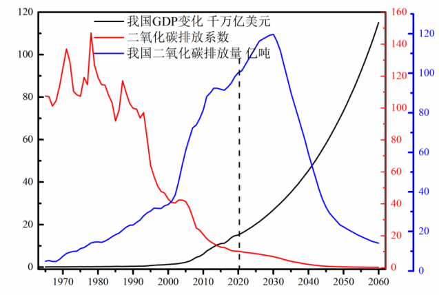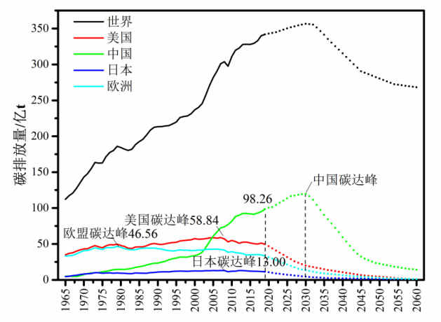 根據(jù)BP數(shù)據(jù),2019年我國二氧化碳排放量為98.26億噸,占世界的28.8%。從我國與歐盟、美國等歷史碳排放量和預(yù)期增長趨勢看(圖1),歐盟、美國、日本在1979年、2007年、2008年已實(shí)現(xiàn)碳達(dá)峰。我國十八大報(bào)告指出,要大力推進(jìn)生態(tài)文明建設(shè),堅(jiān)持節(jié)約資源和保護(hù)環(huán)境的基本國策,堅(jiān)持節(jié)約優(yōu)先、保護(hù)優(yōu)先、自然恢復(fù)為主的方針,著力推進(jìn)綠色發(fā)展、循環(huán)發(fā)展、低碳發(fā)展,形成節(jié)約資源和保護(hù)環(huán)境的空間格局、產(chǎn)業(yè)結(jié)構(gòu)、生產(chǎn)方式,從源頭上扭轉(zhuǎn)生態(tài)環(huán)境惡化趨勢,為人民創(chuàng)造良好生產(chǎn)生活環(huán)境,為全球生態(tài)安全作出貢獻(xiàn)。