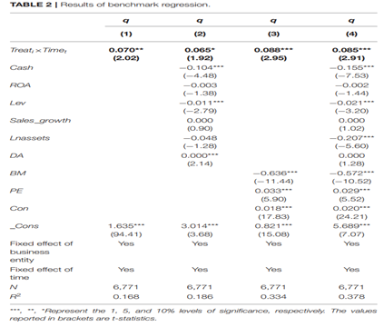 基準(zhǔn)回歸結(jié)果如下表所示,由回歸結(jié)果可知,無(wú)論是否加入控制變量,核心解釋變量的系數(shù)均顯著為正,表明綠色金融試點(diǎn)政策顯著提升了試點(diǎn)地區(qū)綠色企業(yè)的長(zhǎng)期價(jià)值。
