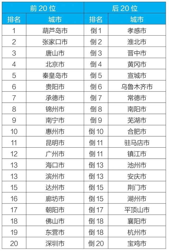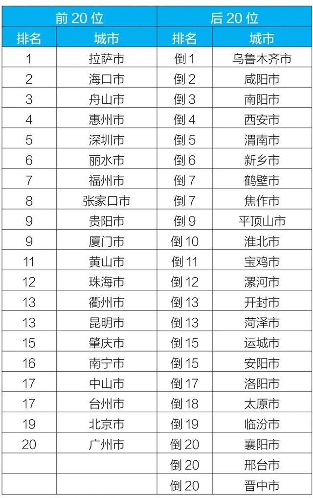 3月,168個重點城市中,??凇⒗_和舟山市等城市空氣質(zhì)量相對較好(從第1名至第20名);咸陽、太原和陽泉市等城市空氣質(zhì)量相對較差(從倒數(shù)第1名至倒數(shù)第20名),見附表1。