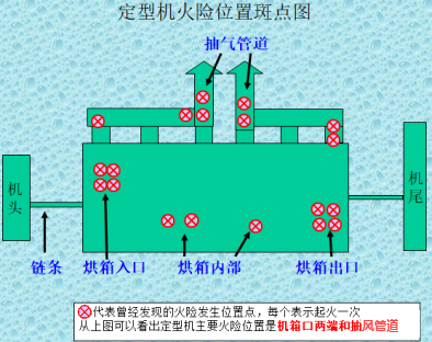 由下圖可知,定型機著火點主要集中在烘箱的進出口和管道內(nèi)部,風(fēng)機拉風(fēng),火借風(fēng)勢,使得火勢蔓延起來非???,救災(zāi)稍有延誤對印染企業(yè)就會造成不可挽回的損失。因此,如何將發(fā)現(xiàn)火情、熄滅火勢的時間壓縮到極致,是三鑫自動化重點突破的課題。