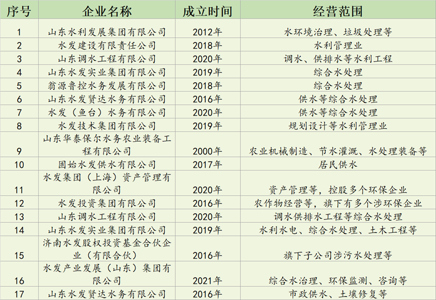 據(jù)中國水網(wǎng)不完全統(tǒng)計,水發(fā)集團旗下涉足環(huán)保的企業(yè)有17家: