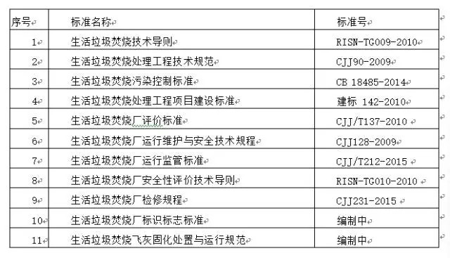 下表為近年來(lái)關(guān)于生活垃圾清潔焚燒標(biāo)準(zhǔn)和評(píng)價(jià)體系的標(biāo)準(zhǔn)規(guī)范等。