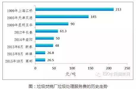 隨著中國(guó)城市化的加速,城市人口大幅增加,城市垃圾量也急劇增多,當(dāng)前,城市生活垃圾累積堆存量已達(dá)70億噸,而全國(guó)垃圾年產(chǎn)量仍以每年8%-10%的速度增長(zhǎng),與GDP增速匹敵,預(yù)計(jì)截止到2020年,城市垃圾產(chǎn)量將達(dá)約3.23億噸。垃圾焚燒發(fā)電是解決“垃圾圍城”的重要方式之一。由于在實(shí)施垃圾焚燒發(fā)電項(xiàng)目前期投資金額大,故一般采取PPP/BOT方式進(jìn)行,項(xiàng)目投資回收主要依靠上網(wǎng)發(fā)電收入及垃圾處理服務(wù)費(fèi)補(bǔ)貼收入。近16年來(lái),垃圾處理的政府補(bǔ)貼費(fèi)用呈現(xiàn)大幅下跌狀態(tài)(如下圖)。