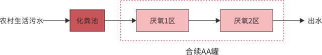 生活污水經(jīng)農(nóng)戶(hù)管網(wǎng)收集后首先進(jìn)入化糞池單元,后流至AA罐分戶(hù)污水處理設(shè)備內(nèi),從厭氧1區(qū)到厭氧2區(qū)。