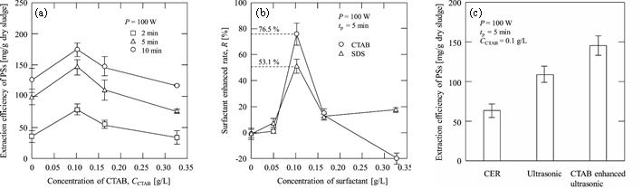 圖2 不同影響因素的提取效率。(a)不同的脈沖超聲時間下PSs的提取量與CTAB濃度之間的關系;(b)CTAB和SDS的添加濃度與表面活性劑強化比之間的關系;(c)三種方法下剩余污泥中高分子物質的提取量(來自原文)
