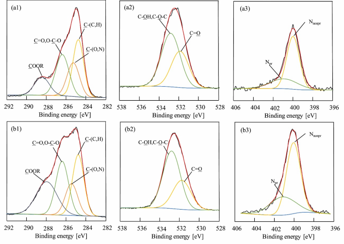 圖6 高分辨率XPS圖。C 1s (a1、b1)、O 1s (a2、b2)和N 1s (a3、b3),PSus(a1~a3)和PSu(b1~b3)(來自原文)