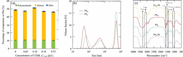 圖4 高分子物質的特性分析。(a)多糖、蛋白質和DNA的質量百分比;(b)PSus和PSu的典型粒度分布;(c)各PSs的FTIR(來自原文)