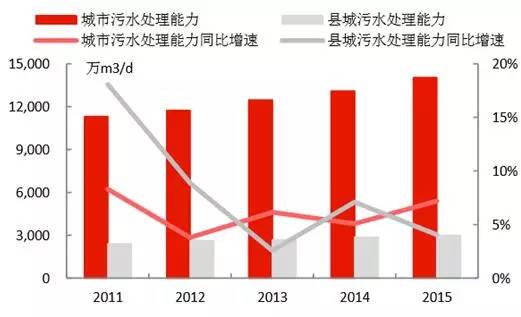 4)城市污水處理能力在2015年達到1.40億立方米/日,同比增長7.19%;縣城達到2999萬立方米/日,同比增長了4.06%,城市和縣城的污水處理率分別達到91.9%和85.2%,較2010年分別提升了9.6和25.1個百分點。