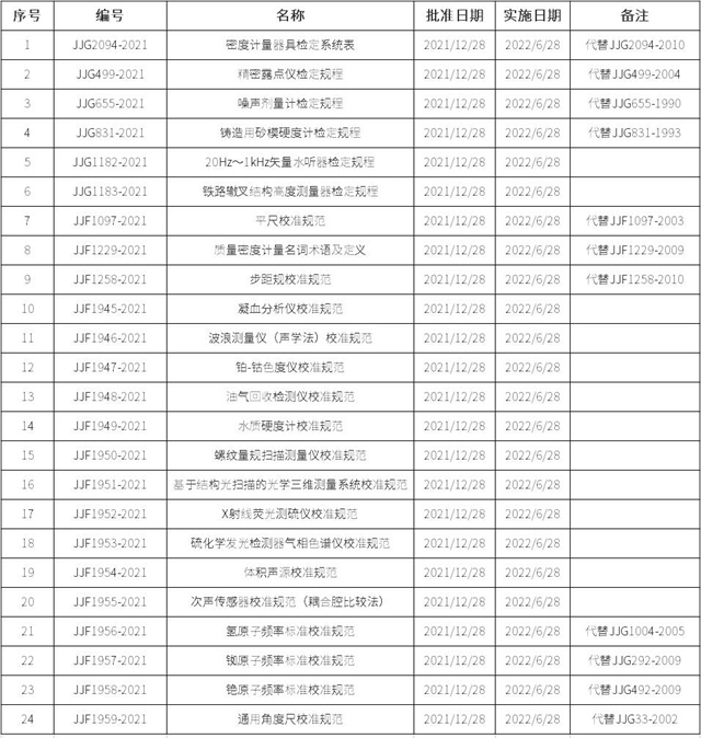 2021年12月30日,市場監(jiān)管總局發(fā)布了24項(xiàng)國家計(jì)量技術(shù)規(guī)范,均自2022年6月28日起實(shí)施。