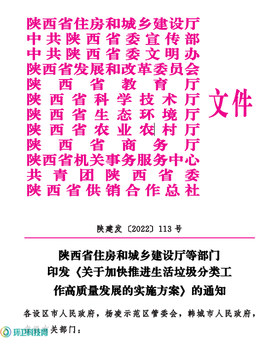 陜西省住房和城鄉(xiāng)建設(shè)廳等部門(mén)印發(fā)《關(guān)于加快推進(jìn)生活垃圾分類(lèi)工作高質(zhì)量發(fā)展的實(shí)施方案》的通知