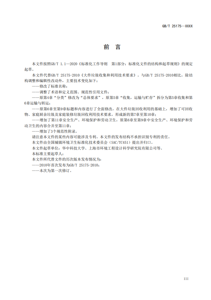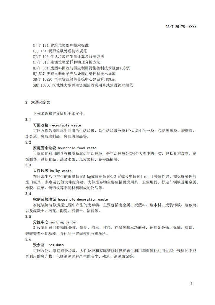 由于標(biāo)準(zhǔn)系由大件垃圾國標(biāo)修訂而來,因此首先在術(shù)語部分進(jìn)行了修改,對“可回收物”、“家庭廚余垃圾”、“大件垃圾”、“家庭裝修垃圾”、“分揀中心”和“殘余物”六項(xiàng)做出定義。