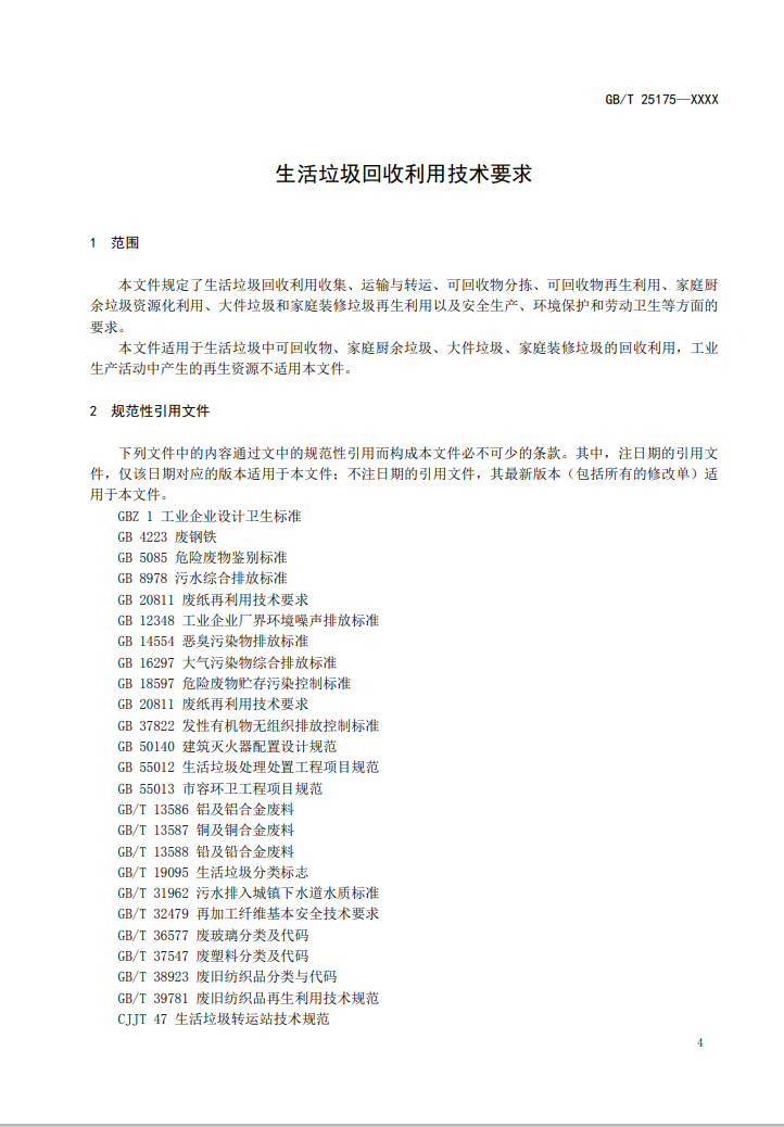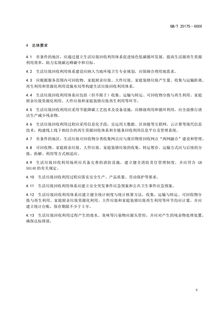 4、生活垃圾回收利用體系應(yīng)包括(但不限于)收集、運(yùn)輸與轉(zhuǎn)運(yùn)、可回收物分揀與再生利用、家庭廚余垃圾資源化利用、大件垃圾和家庭裝修垃圾再生利用等環(huán)節(jié)。
