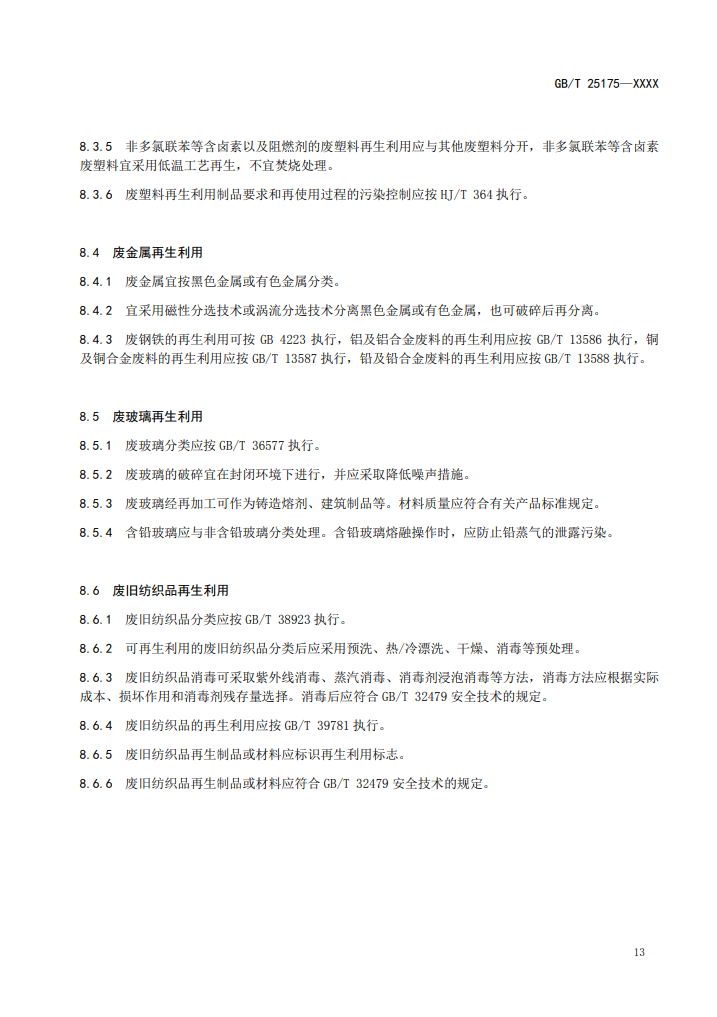 3、廢鋼鐵的再生利用可按GB4223執(zhí)行,鋁及鋁合金廢料的再生利用應(yīng)按GB/T13586執(zhí)行,銅及銅合金廢料的再生利用應(yīng)按GB/T13587執(zhí)行,鉛及鉛合金廢料的再生利用應(yīng)按GB/T13588執(zhí)行。