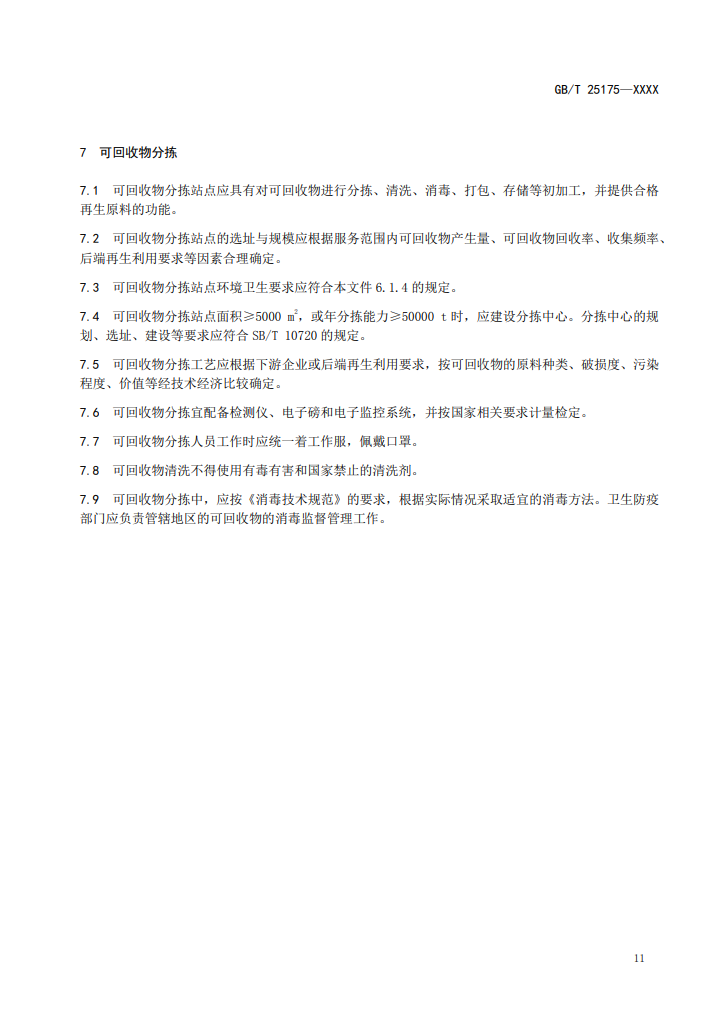 4、可回收物分揀站點(diǎn)面積≥5000m2,或年分揀能力≥50000t時(shí),應(yīng)建設(shè)分揀中心。分揀中心的規(guī)劃、選址、建設(shè)等要求應(yīng)符合SB/T10720的規(guī)定。