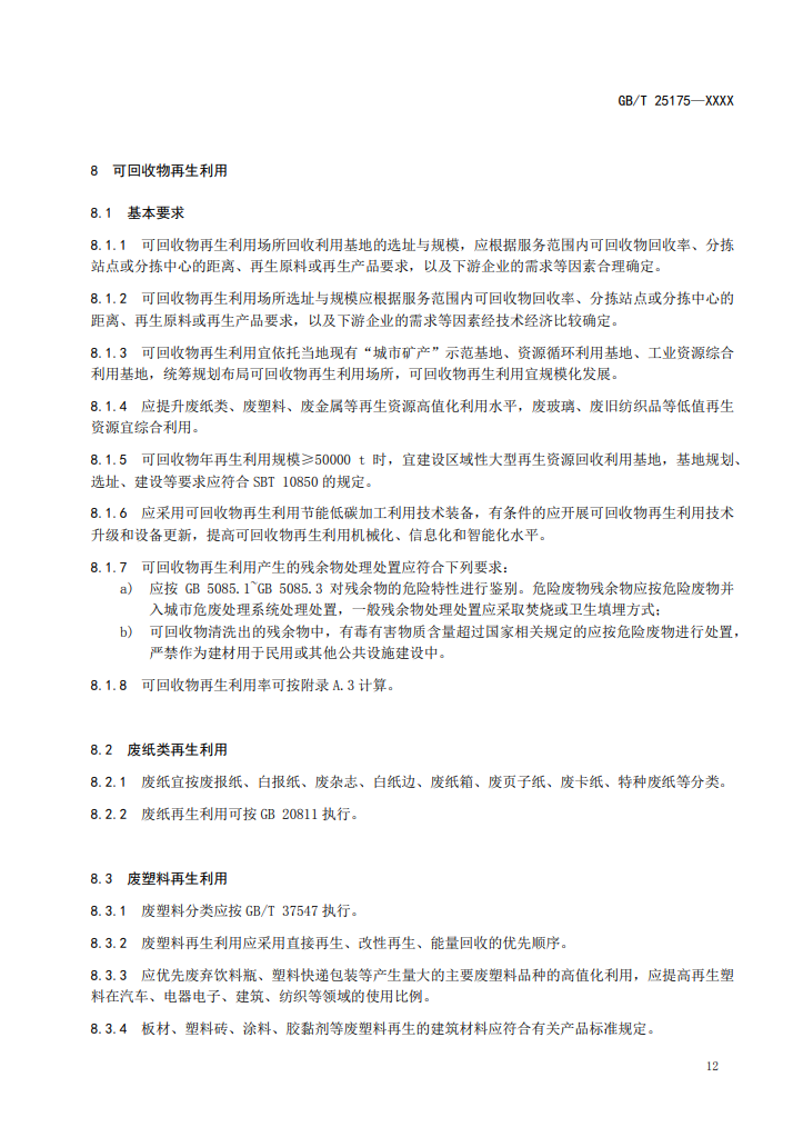 5、可回收物年再生利用規(guī)?!?0000t時(shí),宜建設(shè)區(qū)域性大型再生資源回收利用基地,基地規(guī)劃、選址、建設(shè)等要求應(yīng)符合SBT10850的規(guī)定。